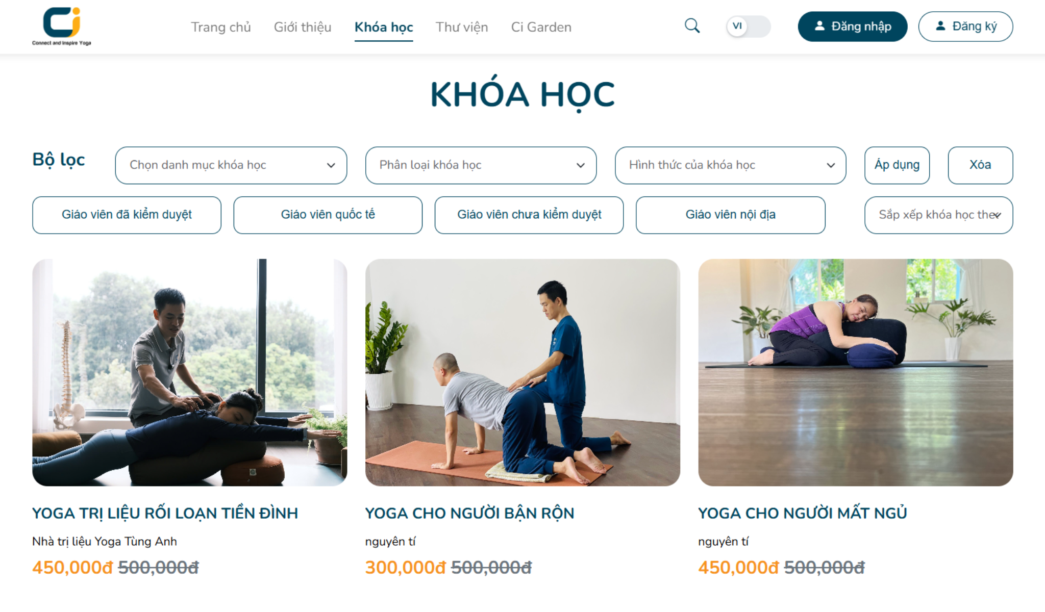 • Danh mục khóa học: Phân loại rõ ràng theo mục tiêu (giảm stress, cải thiện vóc dáng, trị liệu), trình độ (cơ bản – nâng cao) và hình thức học.